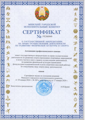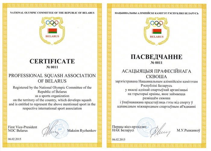 В феврале 2015 года "Ассоциацию профессионального сквоша" официально признал Национальный олимпийский комитет Республики Беларусь в качестве единственной спортивной организации, развивающей вид спорта, не вошедший в программу Олимпийских игр – сквош – на территории Республики Беларусь и предоставил право представлять Республику Беларусь в соответствующих международных спортивных организациях.