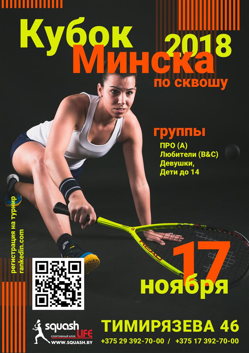 Спортивный клуб «Squash-Life» и Ассоциация профессионального сквоша приглашает Вас 17 ноября принять участие в турнире по сквошу! Кубок Минска 2018 Место проведения: г.Минск, ул. Тимирязева, 46 Участие в турнире - 35р. Заявки на турнир здесь Вход для зрителей свободный подробнее
