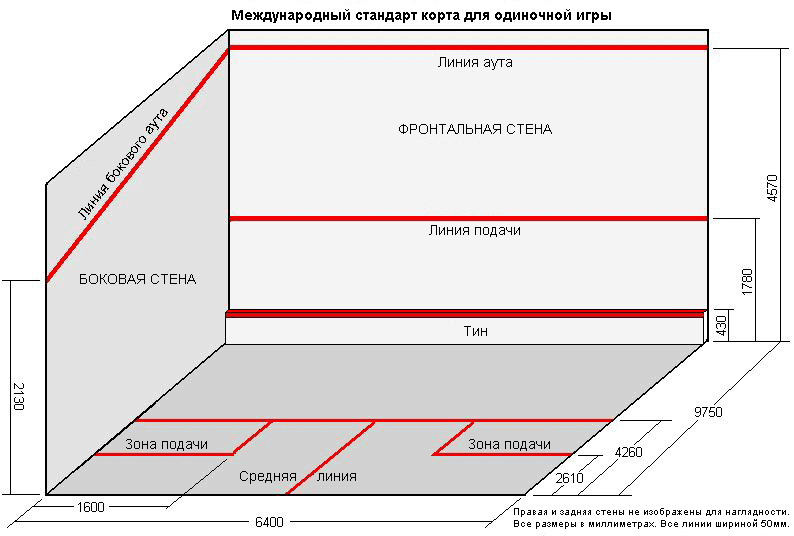 В сквош играют на прямоугольной площадке 9,75м х 6,4м, которая со всех 4-х сторон окружена стенами. Вверху по всем 4 стенам (на фронтальной стене - на высоте 4,57 м, на задней стене - 2,13 м) проходит линия аута, внизу на фронтальной стене расположена акустическая панель 0,48 м в высоту ("жестянка") - именно они ограничивают игровое пространство. Существуют части разметки на полу, играющие роль исключительно во время подачи мяча, а в процессе игры не имеющие значения.